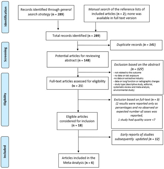 We included studies reporting results on incidence and mortality from malignant and non-malignant respiratory effects derived from talc mining; results on respiratory function were excluded. Only full articles published in peer-reviewed journals were considered. Descriptive studies, as well as case reports, conference proceedings, theses, letters to the editor, and articles for which the full text was not available either online or by request to the journal, were excluded. Other systematic reviews or meta-analyses were included in the review but not in the meta-analysis.
