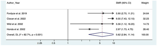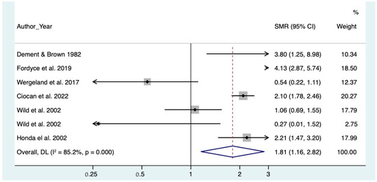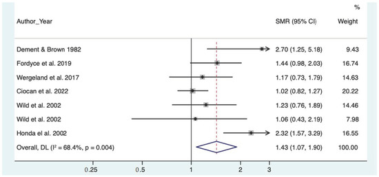 The risk for malignant mesothelioma could not be calculated due to an insufficient number of studies assessing this outcome. Only one study (Fordyce 2019 [12]) reported the SMR = 1.004, with one mesothelioma death after the reanalysis of the death certificates by a trained nosologist. Another death for mesothelioma was reported by Lamm and Starr [27] in an earlier follow-up of this cohort, but was not confirmed by Fordyce et al. There were no cases of mesothelioma reported in the cohorts from Italy [11], France, and Austria [13]. Dement et al. [25] reported one death due to mesothelioma in the study population. Honda et al. [26] found two deaths from mesothelioma; these authors stated that because of the short latency for the first case and the low talc exposure of the second case, it is unlikely that either case was due to talc ore dust. Overall, there were five deaths for mesothelioma in all the cohorts.