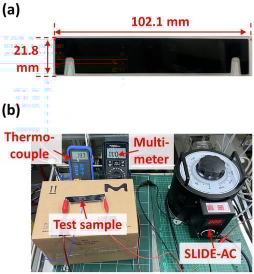 In our previous study, we applied alternating current (AC) power to carbon surfaces with microorganisms, which were completely deactivated after exposure to 50 °C for 10 min []. In this study, we selected one of the commercially available carbon surfaces, the performance of which was demonstrated in a previous study []. The selected carbon surface had low electric resistance (~5.84 × 10−2 Ω·m) to achieve high surface temperature with low energy consumption and was coated with a polyethylene terephthalate (PET) layer to realize lightweight and flexible properties [], thus ensuring an energy-efficient antiviral ESP. Figure 1a shows a digital photo of the carbon surface, which had a width, height, and thickness of 102.1, 21.8, and 0.3 mm, respectively. Figure 1b shows the experimental setup of the electrical resistance test for the characterization of electrothermal properties with AC power using SLIDE-AC. The generated current–voltage, which was measured by a multimeter, was applied to the carbon surface to generate heat, and the surface temperature was measured using a thermocouple.