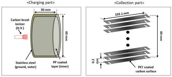 In this study, a two-stage ESP, which consisted of a charging part and a collection part, was developed for the PM removal test with electrothermal carbon surfaces. A detailed view of the two-stage ESP is shown in Figure 2. The charging part (40 × 40 × 30 mm3) consisted of a carbon brush-type ionizer located at the center of the duct (Figure 2, left), and the collection part (40 × 40 × 100 mm3) consisted of collection plates and the ground plates with a 2-mm gap distance (Figure 2, right). In the charging part, a commercial carbon brush-type ionizer was selected with an average fiber diameter of ~7 μm, which is optimal for discharge electrodes to minimize ozone generation [,,,] with negative high voltage. Moreover, a plastic (polypropylene; PP) coating was applied to the metal ground electrode of the discharging stage to effectively suppress the generation of ozone [] in the charging part of the two-stage ESP. In the collection part, PET-coated carbon surfaces were used for both the collection plate and ground electrodes. With the flexibility of the PET coating surfaces, the gap distance between the electrodes could be maintained with a high specific surface area and a light weight [].