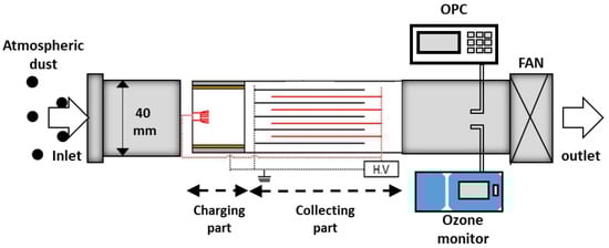 An experimental schematic of the single-pass PM removal efficiency test of the two-stage ESP is shown in Figure 3. Atmospheric dust was selected as the test PM for the performance evaluation of the two-stage ESP. The test duct had an area of 0.04 × 0.04 m, and the flow velocity of the test duct was adjusted to ~2 m/s by controlling the commercial fan speed. The applied voltage to the fiber brush in the ionization stage was controlled from 0 to −6 kV using a negative high-voltage power supply. Due to the relatively sufficient oxygen, the negative ions were more likely to exist in atmospheric conditions (compared with indoor conditions) [,]. To obtain high collection efficiency with high charge density from the abundant negative ions, negative high voltage was applied to generate corona discharge. A voltage of −2 kV was also applied to the collection plate. The applied voltages and corona currents were measured using digital multimeters (Model 286; Fluke Corp., Tokyo, Japan), and the voltage was varied from 0 to −6 kV to the ionizer to investigate the corona discharge properties. The PM concentration was measured using an optical particle counter (OPC, Model 1.109; Grimm, Germany) located at the rear end of the collection stage to measure the PM collection efficiency, which was calculated by (1):