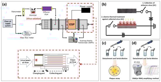MS2 bacteriophage and H1N1 viruses were selected as target airborne viruses. The virus solution was aerosolized by an atomizer in 2 L/min of compressed clean air. Aerosolized virus particles entered the test duct through a diffusion dryer in order to remove any moisture, and 3 L/min of clean air was used as sheath air. The flow velocity of the acrylic duct was adjusted to 0.56 m/s, and the applied voltage of −5 kV to the charging part was controlled. A voltage of −2 kV was applied to the collection part using a high-voltage power supply. The concentration of the airborne virus particles was measured using a scanning mobility particle sizer (SMPS) located upstream and downstream of the ESP (Figure 4a). Then, the collection efficiency of the ESP was calculated as follows: