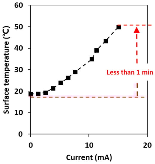 Figure 5 shows the change in surface temperature and current according to the applied voltage under AC power conditions. With an AC current of 15.1 A, the surface temperature of the plate increased to 50 °C in <1 min, and this temperature was maintained for a long time (over 30 min), indicating that the carbon-based surface can easily sustain temperatures up to 100 °C []. In accordance with our previous study, a clear tendency observed was that the temperature was linearly related to the AC current. Thus, the selected carbon surface can be suitable for electrothermal antiviral surfaces, as it was reported that the deactivation of microorganisms was completed after exposure to 50 °C for 10 min and not only with low resistance but also with efficient heat production [].