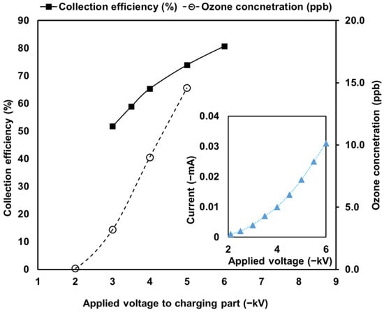 Corona discharge currents (inset), PM collection efficiencies, and ozone concentrations with the increase in the applied voltage to the charging part.