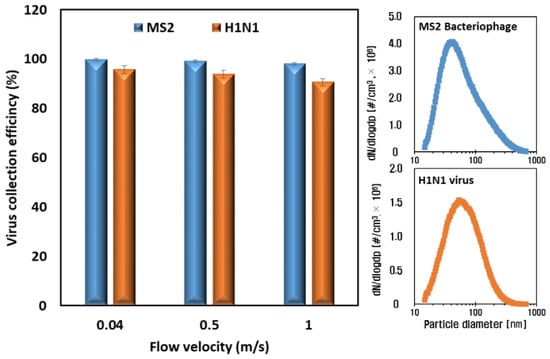Figure 7 shows the results of the airborne virus removal efficiency test of the ESP with voltages of −5 kV and −2 kV applied to the charging part and collection part, respectively. In the cases of all flow velocities, the collection efficiencies against both virus species (MS2 and H1N1) were higher than 90% because the size distributions of the airborne viruses—the mode diameters of which were 60 nm and 80 nm with the MS2 and H1N1 virus particles upstream of the ESP, respectively (Figure 7; right)—have higher electrical mobility than the 0.3 μm of atmospheric dust. The particles with sizes between 0.1 and 0.5 µm had the minimum electrical mobility, and their range corresponded to the most penetrating particle size (MPPS), indicating that this range of particles has less ability to move in an electric field, resulting in a lower collection efficiency in the collection part. However, higher electrical mobility for the particles in the range of 60–100 nm in diameter, whose main charging mechanism is diffusion, resulted in higher collection efficiency in the collection part [,]. Moreover, the migration velocities, which are proportional to the Cunningham coefficient, of the 60 nm and 80 nm particles were higher than those of the 0.3 um particles due to the decrease in the fluid drag force [].