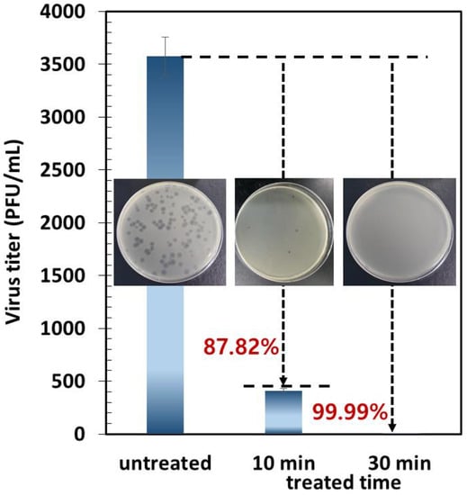 To mitigate the exposure of airborne viral particles in indoor air conditions, air filters or electrostatic precipitators (ESPs) are usually used to capture viral aerosols on the surfaces of filter fibers or collection plates in air-purifying systems. However, previous studies have reported that viral particles can remain active on various surfaces, such as plastic, paper, and stainless steel, for significantly longer time periods than generally expected (over a few days) [,,], which prompted considerable efforts on sterilizing all surfaces so as to suppress the potential risks of fomite-mediated infections []. Many types of antiviral technologies, which were fabricated by coating the surfaces where viral particles are captured with functional materials, have been suggested in recent reports [,,,,]. However, a challenge for these coating-based antiviral strategies is the renewal of antiviral activities for long-term care because of the performance deterioration of coating materials and the accumulation of dust particles over the coating surfaces [,].