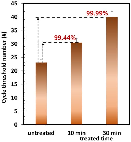 To investigate the electrothermal antiviral efficacy after virus collection for 30 min, the collection surface was electrothermally heated to 50 °C for 30 min. Figure 8 shows the electrothermal antiviral activity of the carbon surface against the MS2 bacteriophage. The results show that the electrothermally heated carbon surface has a tremendous antiviral effect in a short time, as the thermal energy was sufficient for destroying the proteins in the viruses, thus deactivating them [,]. After just 30 min, the electrothermal-based antiviral efficiency against the captured MS2 bacteriophage on the carbon surface was over 99.99% (the number of virus concentrations was under the detection of limit (<10 PFU/mL)), indicating that the viruses were completely deactivated.