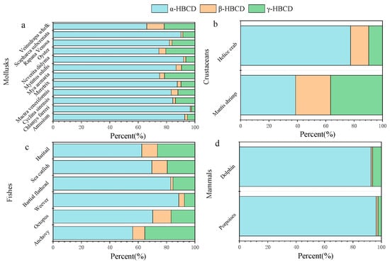 Diastereoisomer patterns of HBCDs in marine biota from China. (a) mollusks; (b) crustaceans; (c) fishes; (d) mammals.