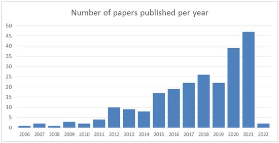 The study period (2006–2022) was covered by articles dealing with the issue of POE methodology (Figure 2). The period from 2015 was particularly rich in scientific contributions, which represented more than 83% of the articles selected in this journal. The years 2020 and 2021 were the most represented years, with 39 and 47 articles published, respectively.