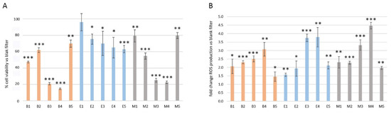 Cytotoxicity and induction of ROS by sample extracts incubated with A549 lung cancer cells. (A) Bar plot represents the percentage of cell viability after exposure to each of the sample extracts for 72 hours with respect to the samples exposed to blank samples. (B) Bar plot represents the fold change in ROS production after 2 h of cell exposure to each of the sample extracts with respect to cells exposed to blank extracts. Results are representative of n = 5 assays (cytotoxicity) and n = 3 assays (ROS) performed in triplicate; error bars indicate the standard deviation. Statistical significance was assessed by the T-test. p values: * <0.05; ** < 0.01, *** < 0.005.