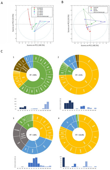 Metabolomics analysis of lung cancer cells exposed to PM10 filter extracts. PCA analysis of lipid areas matrix considering (A) different locations or (B) different collection dates. (C) MCR-ALS resolved components of metabolomics data. For each component, the left bar plot represents the sample contribution to the component. The right bar plot indicates the metabolite profile of each resolved component. Different color bars in these plots are only meant to facilitate the vertical correspondence to the x-axis in all the plots.