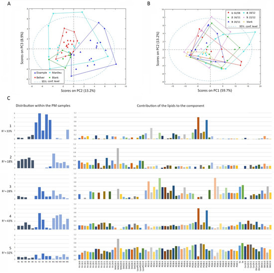 After 72 h of cell incubation with the extracts obtained from the 15 air filters, lipids were extracted and subjected to LC-HRMS. From the LC-HRMS data obtained, the peak areas of 112 lipids (61 and 51, in positive and negative ionization, respectively) were calculated for each of the biological samples and replicates, following a targeted approach (see Methods section). The PCA exploratory analysis of lipidomics data revealed that M samples, due to their high variability, could not be distinguished from the others. However, a 13% variance explained that E samples had a different lipidomic profile from blanks, and 9% of the variance showed differences among B and blank samples (Figure 3A). However, no differences were observed when samples were classified by the collection date (Figure 3B), indicating that the changes in lipid profiles were only location dependent, in this case, only for E and B samples. A PLS-DA model between E and blank samples showed that a cumulative variance of 78% in two latent variables (LV) could discriminate both types of samples, with an MCC = 0.92, indicating that there was very good discrimination between the two groups and that E samples were inducing significant changes in the cell lipid profiles. In the case of the PLS-DA model discriminating between B samples and blanks, 74% of the explained variance from 3 LV was providing perfect discrimination, with an MCC = 1. As expected, samples from M could not be discriminated from blanks. From the successful PLS-DA models, a unique list of lipids was selected using only the features that had VIP values higher than 1 in at least one of the PLS-DA models. As a result, a new data matrix containing the fold changes of 70 lipids in all the samples with respect to the blanks was obtained (see Supplementary Materials). This new fold-change data matrix was further processed by MCR-ALS to obtain the main lipidic profiles found under PM10 extracts exposure. As a result, five different components that retained 98.9% of explained variability were resolved (Figure 3C). Component 1 (33% of variance) explained the changes observed in the urban traffic site E samples. The lipidic profile was mainly associated with the increase in two phosphatidylglycerol (PG) species (36:0 and 38:1). Component 2 (18% of variance) was related to B and M samples and was represented by monoacylglycerol (MAG) 20:1 and the increase in four saturated fatty acids (FA) species (16:0, 20:0, 22:0, and 24:0). Component 3 (28% of variance) was common to E2, E3, M1, M2, and M3 and their lipid profile was related to the increase in different phosphatidylethanolamine (PE) and phosphatidylserine (PS) species, sphingosine (So) and sphinganine (Sa), among others. Component 4 (43% of variance) involves the same samples as 3 but with higher contribution, and includes M5, B3, and B4 samples. This component explains again the increase in PG 36:0 and PG 38:1, but this time in association with ceramide (Cer) 22:1 and dihydroceramide (DhCer) 24:1, among other small contributions. Finally, component 5 (32% of explained variance) was found to be present in all the samples, with minor contributions of B4, E2, and M1. The lipid profile contained important contributions of almost all the lipids, with the most intense contribution from MAG 20:1, PGs, and Cer species.
