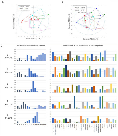 Following a parallel experimental procedure as for lipidomics, metabolites were extracted from A549 lung cancer cells exposed for 72 h to PM10 air filter extracts. These metabolite extracts were analyzed using LC-HRMS, and the resulting data were further processed following an untargeted approach by the means of an MSDIAL program. As a result, a matrix of peak areas of 292 features in all the samples was obtained and analyzed by PCA. The PCA scores plot clearly showed differences between B and M samples in respect to blanks and some overlapping between E samples and blanks (Figure 4A). As happened in the lipidomics study, if samples were grouped by their collection date, no time patterns were observed, and they could not be separated in groups (Figure 4B). PLS-DA models were built for each of the air quality station groups in contrast to the blank samples. The PLS-DA model between B and blank samples showed that with one LV (48% of X-variance to explain 64% of Y), sample discrimination was already very good, with an MCC = 0.85. The model between M and blank samples also provided the same discrimination score with one LV (28% of the X-variance to explain 76% of Y). The discrimination between E and blank needed three LV (39% of cumulative X-block variance to explain 93% of Y) to have an MCC = 0.8. Only features identified with an MSDIAL score higher than 80% and that presented a VIP value higher than 1 in any of the PLS-DA models were finally selected for further analysis. As a result, a list of 30 metabolites was obtained, and fold changes between peak areas found in samples exposed to extracts and those exposed to the blank sample were calculated (see Supplementary information). The fold change data matrix was processed by MCR-ALS, resulting in five components that explained 97.5% of the total data variance (Figure 4C). Component 1 (43% of variance) was abundant in the suburban background samples M and also in E1 and E3. In this component, the most relevant compound was palmitic acid, that, together with L-serine, contributes to the initial steps of de novo biosynthesis of sphingolipids (SL). Other important compounds in this component were cytosine, cytidine, and uridine, which are relevant elements of the pyrimidine metabolism. Component 2 (35% of the explained variance) was dedicated to E samples (with the exception of E1) and B samples (except for B4). This was associated with the levels of creatinine, a subproduct of creatine synthesis; lysophosphatidylamine (Lyso PE 18:1); the amino acid tyrosine, a precursor for neurotransmitters and hormones, as well as part of many proteins; pyridoxine; and the sphingolipid (SL) base sphinganine, among others. Component 3 (23% of explained variance) was mostly relevant to sample E4, although it was also found in a small proportion in the other E samples. In this component, spermidine, an aliphatic polyamine involved in many biological processes, and five representative compounds of purine metabolism (guanine, inosine, hypoxanthine, adenine, and adenosine) were found to be very relevant. Component 4 (22% of the total variance) was common to B and M samples, being more abundant in B3, B4, and B5. The most important related metabolites were oleic acid; histamine, a histidine derivative by decarboxylation involved in immunological responses and acting as a neurotransmitter; and N-methyl proline. Finally, component 5 (22% of explained variance) was mostly present in sample M1 and in the majority of E samples. The most relevant metabolites in this component were N-acetylglutamic acid, related to the L-arginine biosynthesis, isopalmitic acid, and pyridoxine, involved in vitamin B6 metabolism.