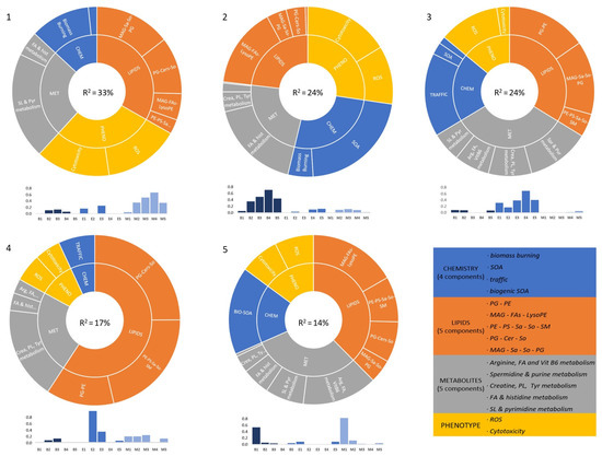 Performing a transversal analysis of the different data blocks analyzed is a complicated task, due to the elevated number of variables contributing to each type of information. To simplify the interpretation of the effects related to each of the sources of pollution, the mid-level data fusion of the MCR-resolved components obtained in the analysis of each data block separately, together with the phenotype features (ROS and cytotoxicity), was performed. The MCR-ALS analysis on this new row-wise concatenated/augmented data matrix enabled the finding of connections between different biological effects and, more importantly, finding of potential causality associations between the chemistry (expressed as sources of pollution) and the cell responses. The most relevant results of this data fusion are represented in components 1, 2, 3, and 5, which clearly associated the four sources of pollution resolved (traffic, SOA, biomass burning aerosols, and biogenic SOA, respectively) to different biomolecular and phenotypic changes. In these components, there is a balanced contribution of the four data blocks (sources of pollution, lipids, metabolites, and phenotype), indicating similar importance on them and a high correlation of their elements to characterize the biological effects of the resolved sources of pollution.