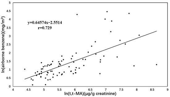 Figure 2. Correlation between natural logarithmic transformed benzene exposure levels (mg/m3) and t, t-MA values (μg/g creatinine).