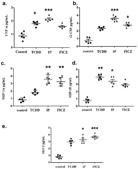 In the case of the macrophage inflammatory proteins, all three AhR agonists were found to be significantly increased, but a comparison among them provided varied results. As shown in Figure 2c, both IP and FICZ-treated cells secreted equal levels of MIP-1α cytokine. However, as shown in Figure 2d, TCDD treated cells secreted slightly increased levels of MIP-1β cytokine. Also, in Figure 2e, FICZ treated cells increasingly secreted MIP-2 cytokine compared to TCDD and IP.