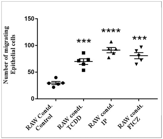 Increased motility is a characteristic of epithelial cells that experienced EMT (epithelial mesenchymal transition). A general marker for EMT differentiation is cell migration []. To determine the influence of AhR ligands in mouse macrophages (Supplementary Figure S2) and mouse pulmonary epithelial cells (Supplementary Figure S3) individually, a Boyden chamber-oriented cell migration assay was carried out. As shown in Figure 3, upon treatment with AhR agonists, the migration of macrophage cells was observed, where IP was found to be more effective than TCDD and FICZ. These results were similar in the case of epithelial cell migration (Figure 4). IP was found to be most effective in both cases. To test our hypothesis that the release of cytokines through the activation of AhR by macrophages had an effect on epithelial cells, we treated epithelial cells with a RAW 264.7 cell-conditioned medium. Macrophage cells were treated for 24 h in serum-free culture medium containing TCDD (10−8 M), IP (10−7 M), and FICZ (10−7 M). MLE-12 cells were seeded for 10–12 h and were treated with RAW 264.7 conditioned medium for 24 h (Supplementary Figure S4). As shown in Figure 5, IP was found to be upregulated significantly higher compared to TCDD and IP. The above results demonstrate that epithelial cell migration is influenced by pro-inflammatory cytokines that induced a microenvironment created by macrophages upon activation by AhR.