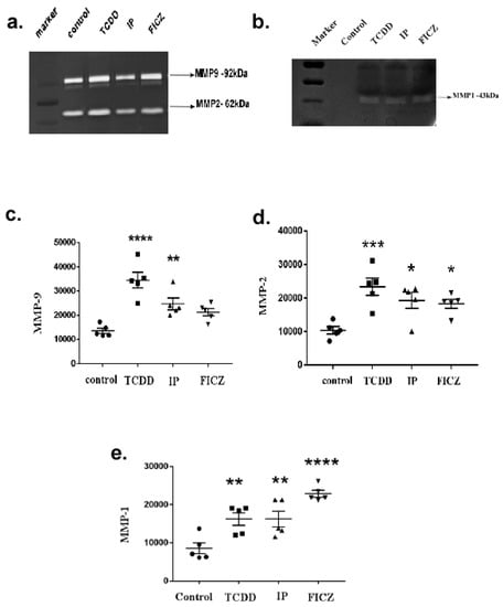 A multitude of cytokines and growth hormones, such as IL-1 and TNF-α, affect MMP transcription []. A recent study revealed that AhR signalling regulates MMPs, which play a major role in ECM deposition and the metabolism of its components []. The results of the present study indicate a substantial increase of MMP-2, MMP-9 and MMP-1 by all three AhR agonists. In agreement with the above results, we found that TCDD significantly induced MMPs compared to FICZ and IP. In particular, MMP-1 was found to be significantly more highly expressed by FICZ.