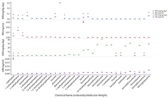 | Inhalation Unit Risk | IUR | California EPA [72]; EPA Comptox Chemicals Dashboard [65]; CTV [67] |