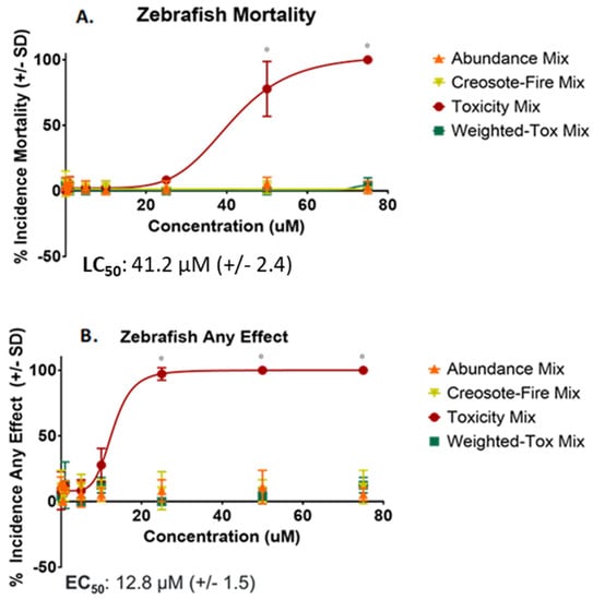 - Geier, M.C.; James Minick, D.; Truong, L.; Tilton, S.; Pande, P.; Anderson, K.A.; Teeguardan, J.; Tanguay, R.L. Systematic developmental neurotoxicity assessment of a representative PAH Superfund mixture using zebrafish. Toxicol. Appl. Pharmacol. 2018, 354, 115–125. [Google Scholar] [CrossRef]