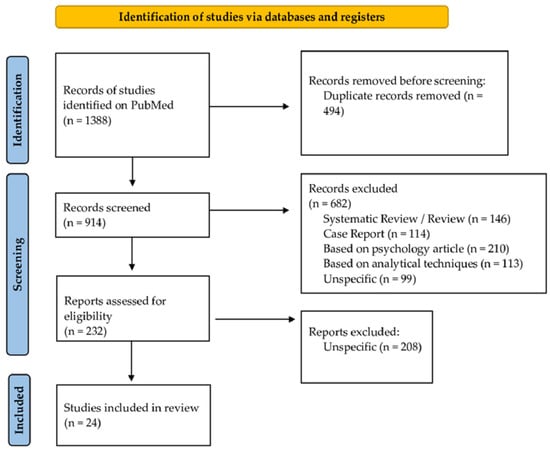 Initially, articles were selected on the basis of title and abstract. Subsequently, a full-text evaluation of the selected studies was carried out. On the basis of the literature search, 1338 studies were identified. To begin with, 494 duplicates were removed, and 914 records were screened. Then, 682 records were excluded as per the exclusion criteria. After full-text evaluation, another 208 records were excluded because they were unspecific. The quality of each study was evaluated independently by G.M. and G.D.A. If there was a conflict of opinions regarding the articles, they were submitted to A.A. Finally, 24 articles were included in the current review. A detailed flow chart of the selection process is provided in Figure 1.