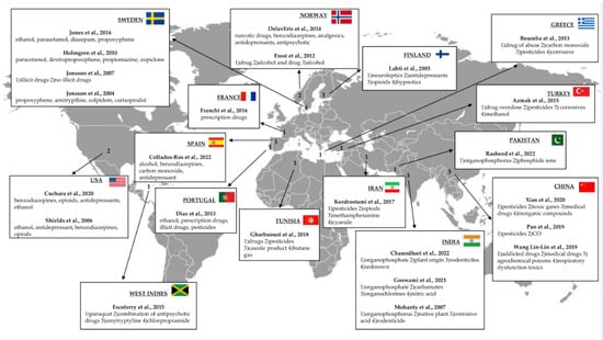 Representative figure illustrating the number of autopsies in cases of suicide by self-poisoning and the most frequent types of toxic substances used and their worldwide distribution, according to the articles included in this review [18,19,20,21,22,23,24,25,26,27,28,29,30,31,32,33,34,35,36,37,38,39,40,41].