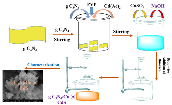 g-C3N4, already prepared in 2.2.1, was used in this section. Heterogeneous ternary composites were synthesized by adding 0.144, 0.246, 0.383, 0.575, 0. 8625, and 1.342 g of g-C3N4 to obtain the composite with 20, 30, 40, 50, 60, and 70% of g-C3N4, respectively. To create a fine suspension, these quantities were dispersed individually in deionized water and agitated for an hour. Method 2.2.3 was followed subsequently. A total of 25 mL of 0.25 M solutions of CdAc2 were added to this suspension with a 0.2 g Polyvinylpyrrolidone (PVP) capping agent. A total of 12.5 mL of 0.05 M CuSO4 solution was added, followed by stirring for 30 min at 80 °C. pH was adjusted at 11–12 using a 4 M NaOH solution. 30 mL of 0.25 M thiourea solution was added dropwise. Yellow-colored precipitates of CdS were obtained which were filtered and washed. The formation of g-C3N4/Cu@Cds nanocomposite is shown in (Figure 1).
