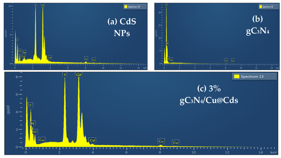 EDX is an analytical technique that provides information about the elemental composition of synthesized materials. When a material is hit by electromagnetic radiation, it emits X-rays, which were then analyzed by using the EDX technique. The sample is targeted by a high-energy laser in an EDX instrument. (Figure 3a–c) shows the EDX spectra of gC3N4 CdS NPs, and 40%g-C3N4-5%Cu@Cds nanocomposite. In (Figure 3a) the appearance of cadmium (Cd) and sulfur (S) peaks show the presence of these elements in CuS nanoparticles. (Figure 3b) indicates the presence of carbon (C) and nitrogen (N) present in graphitic carbon nitride. (Figure 3c) displays the EDX spectra of/g C3N4/Cu@Cds nanocomposite.