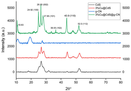 All materials’ phases and crystalline structures were determined using XRD analysis. The virgin and Cu-doped CdS nanoparticles corresponded with the wurtzite structure, according to the XRD patterns in Figure 4 (cod ref code 96-900-8863) [43]. The almost complete absence of peaks demonstrated that the 5%Cu@CdS nanocomposite structures were well matched with the hexagonal phase. According to an analysis of the XRD peaks, the peaks at 2θ = 24.92°, 26.55°, 27.85°, 36.55°, 43.90°, and 52.05° were produced, respectively, by the contributions of the (100), (002), (101), (102), (110) and (112) reflection planes. The CdS photo-diffraction catalyst’s peaks at 2 = 24.860, 26.540, 28.240, 43.890, 47.940, and 51.910 were attributed to contributions from the reflection planes (100), (002), (101), (110), (103), and (112), respectively. The XRD peaks associated with the (100), (002), (101), and (112) reflection planes of CdS were identified in the ZnO/CdS photocatalyst at 2θ = 25.17°, 26.65°, 28.23°, and 52.23°, respectively. Additionally, the effective integration of the Cu dopant was shown by two diffraction peaks at 2θ = 44.280 and 48.130. The peak intensity of the doped CdS phase is noticeably stronger as compared to CdS alone, as a few peaks in pristine CdS are missing. The peak 2θ = 10.63 in the final composite was detected due to impurity. As seen in Figures S1 and S2, 5% g-C3N4/Cu@Cd nanocomposite formation and the electronic states of each of its component parts were determined using XPS analysis. The XPS examination further confirmed the results of the SEM and EDX that the 5% g-C3N4/Cu@CdS included g-C3N4, CdS, and Cu.