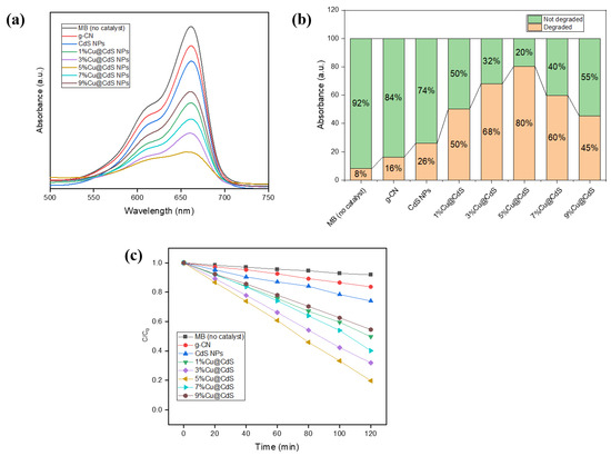 Figure 5a–c shows how the synthetic Cu-doped CdS nanoparticles combined with g-C3N4 degraded the standard pollutant methylene blue (MB) under sunshine, respectively. The highest absorption was seen at 662 nm in all spectral graphs. The intensity of blue dye was decreased initially by adsorption on the catalyst’s surface and further decreased by photo-degradation [44,45]. A decrease in the intensity of peaks showed that MB was oxidized to secondary compounds when exposed to sunlight in presence of a synthesized catalyst. All the samples were exposed to the sun for 120 min, measured to be an average 90–100 kLux using a Lux light meter, during March and April at the University of Management and Technology, Lahore (31.4835° N, 74.4121° E), Punjab, Pakistan.