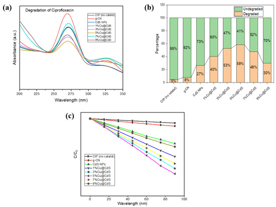 All the samples were exposed to solar radiation for 90 min, measured to be an average of 80 k Lux using the Lux light meter, during the months of February–March at the University of Management and Technology, Lahore (31.4835° N, 74.4121° E), Punjab, Pakistan. (Figure 7a–c) illustrates the degradation of CIP by the synthesized Cu-doped CdS nanoparticles and their composites with g-C3N4, respectively. Maximum absorption was shown at λmax = 270 nm. The concentration of CIP decreased by incident light and 5%Cu@CdS NPs proved to be most efficient among Cu-doped CdS NPs series (59% in 90 min) and 40%g-CN/5%Cu@CdS among composites (76% in 90 min). A decrease in the intensity of peaks showed that CIP successfully degraded secondary compounds when exposed to sunlight in presence of a synthesized catalyst.