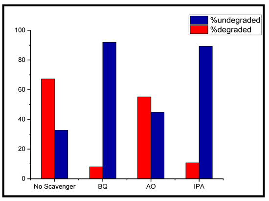 For studying the photo-degradation mechanism of MB by the g-C3N4/Cu@CdS catalyst, the role of the species •OH, H+, and, •O2− responsible for the degradation of MB in the photo-degradation reaction were examined, as given in (Figure 8). To establish the role of the leading active species, benzoquinone (BQ), isopropanol (IPA), and ammonium oxalate (AO) was added to remove superoxide (•O2−), the hydroxyl radical (•OH) and holes (h+), respectively. With the addition of AO to the MB dye solution, the degradation activity of the 40%g-C3N4/3%Cu@CdS catalyst was reduced to 82% (to 76.8% without scavenger), whereas the addition of IPA and BQ showed comparatively little reduction (12% and 16%, respectively) in degradation of MB under the same conditions of light, temperature and pH of dye solution. This confirmed that the generation of holes (h+) plays a key role in the degradation of MB. The photo-generated electrons and superoxide radicals are not as significant as photo-generated holes [46].