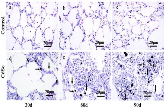The alteration of lung tissue pathological morphology of SD rats induced by CdSe nanorods. The control groups that pulmonary instillation with saline for 30 days (a), 60 days (b), and 90 days (c). Pulmonary instillation CdSe nanorods for 30 days (d), 60 days (e), and 90 days (f). Blackspots are CdSe nanorods-positive sites (right arrows), the lung tissues from CdSe nanorods-exposed rats showed alveolar mucosa with swelling (down arrows), nodular histiocyte hyperplasia (up arrows), and injury. The above typical pictures are selected from the lung tissues of 8 rats in each group.