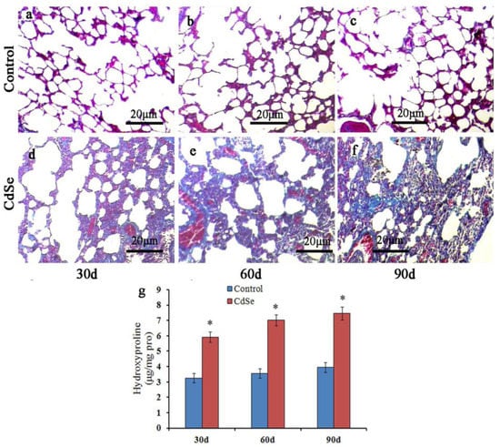 Masson trichrome staining to assess the pulmonary fibrosis. Compared with control groups (a–c), the collagen deposition increased significantly in lung interstitium at 30 (d), 60 (e), and 90 (f) days in CdSe nanorod-induced lung tissues. Detection of hydroxyproline content in lung tissues (g), similar to the changes in the collagen level, hydroxyproline level was also enhanced in CdSe nanorods-induced lungs on days 30, 60, and 90. Data are shown as mean ± SD (* p < 0.05, as compared with those in the normal control groups). The above typical pictures are selected from the lung tissues of 8 rats in each group.