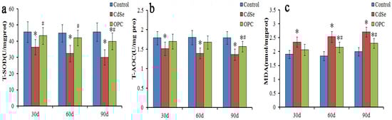 The bar graph showing SOD and T-AOC activity (a,b) and MDA content (c) in lung tissues of rats. They were measured using microplate reader represented as mean ± SD in the control groups, CdSe nanorods groups and OPC treatment groups for 30, 60, and 90 days (* p < 0.05, as compared with the normal control groups, # p < 0.05, as compared with the CdSe groups).