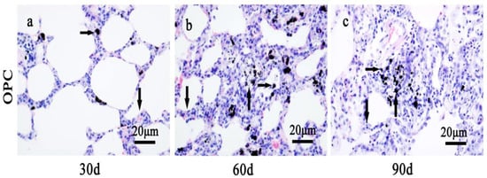 The alteration of lung tissue pathological morphology of SD rats after the repair strategy with OPC. (a) Oral administration of OPC for 30 days, (b) oral administration of OPC for 60 days, and (c) oral administration of OPC for 90 days. Black spots are CdSe nanorod-positive sites (right arrows), the lung tissues from OPC groups showed alveolar mucosa with slightly swelling (down arrows), relatively few nodular histiocyte hyperplasia (up arrows). The above typical pictures are selected from the lung tissues of eight rats in each group.