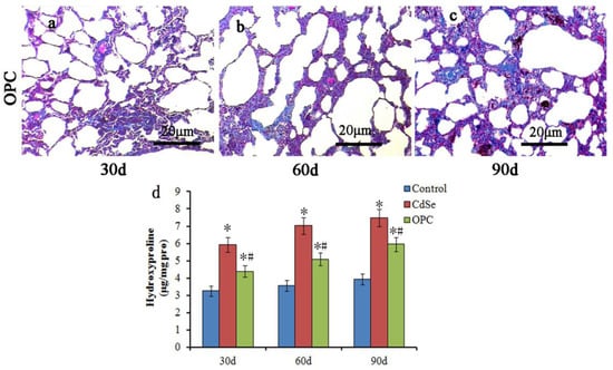 Masson trichrome stain in assessing the pulmonary fibrosis by the OPC effect. The collagen level decreased sharply in the OPC intervention groups compared with that in the CdSe groups at 30 (a), 60 (b), and 90 (c) days, respectively. OPC decreased the hydroxyproline levels effectively in the OPC-treated pulmonary fibrosis lung tissues when comparing with the CdSe groups (d). (* p < 0.05, as compared with the normal control groups, # p < 0.05, as compared with the CdSe groups). The above typical pictures are selected from the lung tissues of 8 rats in each group.