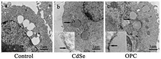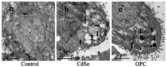 The electron microscopic images in the transmission mode showed the appearance of lipid-containing vesicles and nanoparticles internalized in the fat droplet. The three groups did not observe any obvious organelle lesions. The CdSe nanorods mainly aggregate in the fat droplet. The control groups had transparent and clear fat droplets (Figure 8a), while the CdSe and OPC groups had semitransparent fat droplets. CdSe nanorods mainly aggregated at fat droplets (Figure 8b,c), and the two groups had no obvious difference, thus suggesting that OPC could eliminate free radicals, decrease the excess ROS production, but have no effect on the permeability of cells and organelles.
