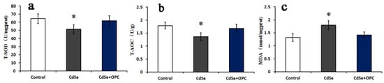 Similar to other toxicity indicators discussed about lung tissues, T-SOD, T-AOC, and MDA levels indicated a greater effect for the rats gavaged with the OPC solution (Figure 3). The activity of T-SOD and T-AOC had slightly decreased, and the MDA levels had slightly increased when compared with those in the control groups after being gavaged with the OPC solution. However, the activity of T-SOD and T-AOC in the OPC groups was significantly higher, and the MDA level was significantly lower when compared with that in the CdSe groups. The findings indicated that those gavaged with the OPC solution could prevent cytotoxicity mediated by free radicals and lipid peroxidation, and protect low-density lipoproteins from oxidation, while CdSe nanorods stimulated lung tissues to produce abundant superoxide anion radicals.