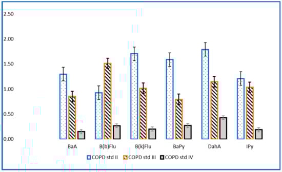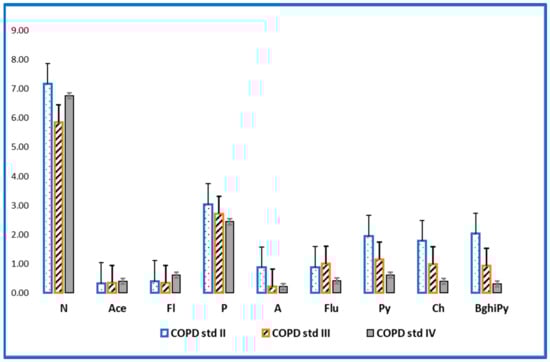 The International Agency for Research on Cancer, 1986, classified PAHs into carcinogenic and non-carcinogenic compounds. Six PAHs have been classified as possible carcinogenic compounds to humans: BaA, B(b), Flu, B(k)Flu, BaPy, Db(a, h)A and IPy. The results obtained in this study show an admission of pollutants according to smoking status (former smokers/smoker/non-smokers) quantified in average total concentrations for the group of patients with COPDs of 4.12 ng/mL, 6.76 ng/mL, and 6.04 ng/mL (Table 2). In the case of the control group, the admission of carcinogenic PAHs was determined at mean concentrations of 1.20 ng/mL, 1.67 ng/mL and 1.99 ng/mL for former smokers/smokers/non-smokers, and these values were much smaller than in the case of the COPD group patients. Similar results for levels of PAHs in the blood have been reported by Neal et al. [].