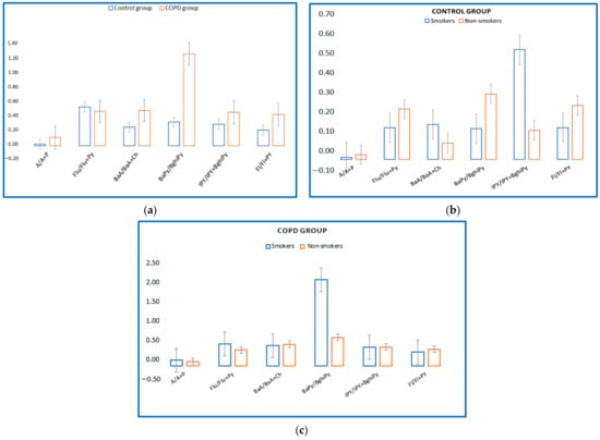 Regarding serum PAHs intake, six different ratios have been proposed that could suggest the source of exposure. In the present study, molecular ratios were investigated for the control group and COPD group (A/A + P; Flu/Flu + Py; BaA/BaA + Py; BaPy/BghiPy and IPy/IPy + BghiP, Fl/Fl + Py proposed by KG Koukoulakis et al. (2020)) to identify the main sources of exposure to PAHs. Figure 3a shows levels of these ratios for the control group and the COPD group. It is thus observed that in the case of the COPD group, the content of PAHs in the blood could be due to PAHs emissions because the ratios Fl/Fl + Py suggest diesel emissions, and the ratios BaA/BaA + Ch and IPy/IPy + BghiPy are derived from vehicle emissions and fuel combustion []. The BaPy/BghiPy ratio indicates non-traffic emissions, and it is observed that in the present study the values are much higher in the group of patients with COPD versus the control group, and this could suggest smoking as the main source of exposure. In Figure 3 it can be observed that smokers in the control group had a high ratio of IPY/IPY + BghiPy (Figure 3b), and in the COPD group, smokers had a high ratio of BaPy/BghiPy (Figure 3c).