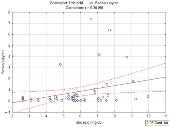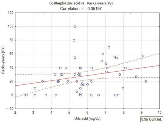 In the present study, the quantification of oxidative stress was studied by analyzing the content of PAHs, serum uric acid values and PAHs in patients diagnosed with COPD. The linear regression model applied to the dataset shows a positive correlation of serum uric acid with BaPy levels (p < 0.05, r = 0.30) in smokers and non-smokers diagnosed with COPD, and also with the smoking status of the patients by association with PY (packs-years) (p < 0.05, r = 0.35) in smokers diagnosed with COPD (Figure 4 and Figure 5).