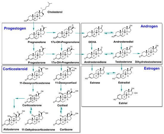 Steroid hormones are cholesterol derivatives that play critical roles in regulating water and salt homeostasis, metabolism, stress response, and in initiating and maintaining sexual differentiation and reproduction []. Steroid hormones are synthesized through a cascade-like pathway in the adrenal cortex, the gonads and the placenta and are released into the blood stream to act in both peripheral target tissues and the central nervous system. The homeostasis of steroid hormones is regulated through hypothalamus-pituitary-gonadal (HPG) and hypothalamus-pituitary-adrenal (HPA) axes [,], which consist stimulatory hormones and feedback loops. Steroid hormones can be classified as estrogens, androgens, progestogens, and corticosteroids (Figure 1), according to their structures and genomic receptors to which they bind []. In general, estrogens (18 carbons with an aromatic ring) are female reproductive hormones, androgens (19 carbons) are male reproductive hormones, progestogens (21 carbons) are pregnancy hormones, and corticosteroids (21 carbons) are stress hormones [].