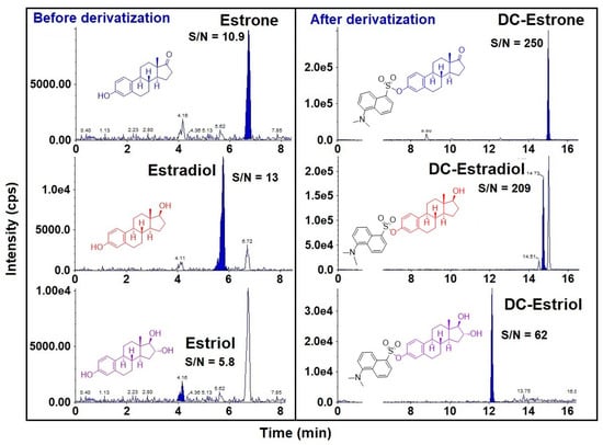 Comparison of LC-MS/MS responses of estrone, estradiol, and estriol before and after dansylation. Concentrations of the analytes were 1 ng/mL; Injection volume was 10 µL.