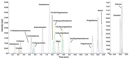 Representative LC-MS/MS chromatograms of 19 steroid hormones in solvent. Concentrations of the target analytes were 100 ng/mL; Injection volume was 10 µL; estrone, estradiol, and estriol were derivatized using dansyl chloride. Estrone and estradiol were shown separately because of their significantly higher intensities than the other analytes.