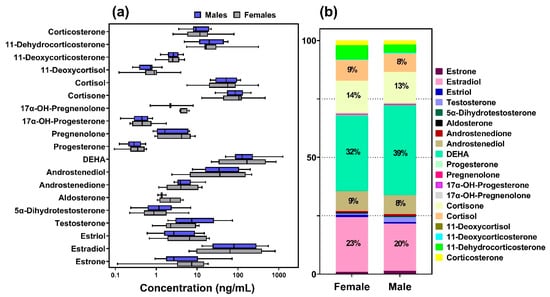 Concentrations (a) and relative distribution (b) of 19 steroid hormones measured in urine from 11 males and 9 females from New York, United States. Mean concentrations were used in the calculation of the percent contribution.