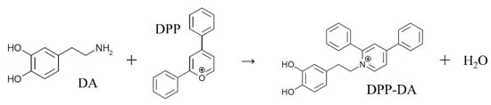 Chemical reaction of DPP-derivatization. DA, Dopamine; DPP, Tetrafluoroborate salt of 2,4-diphenyl-pyranylium.