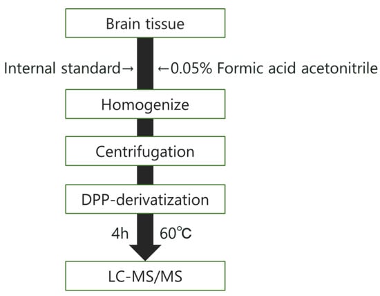 We used the brains that had been collected in Section 2.3.2. First, 200 ppb, 20 µL (for striatum); 10 ppb, 20 µL (for hippocampus); or 100 ppb, 20 µL (for olfactory bulb, cerebral cortex, brainstem, and cerebellum) of IS mix (1 ppm in 70% MeOH containing 0.1% formic acid; diluted with MeOH as appropriate) was added as an internal standard to 1.5 mL tubes (striatum, hippocampus, olfactory bulb) and 2.0 mL tubes (cerebral cortex, brainstem, cerebellum) containing each brain region. Two zirconia beads (2.0 mm, Lot No. 0894-T40, Toray Industries, Inc., Tokyo, Japan) were placed in each 1.5 mL tube, and one zirconia bead (5.0 mm, ZZ50-0001, Bio-medical Science Co, Ltd., Tokyo, Japan) was placed in each 2.0 mL tube. Ice-cold 0.05% acetonitrile formate was added (200 µL for striatum and hippocampus, 100 µL for olfactory bulb, 300 µL for cortex and brainstem, 400 µL for cerebellum) and homogenized in a Tissue Lyser (1 min, 30/s; Retsch, QIAGEN K.K., Tokyo, Japan). Then, each tube was centrifuged (10,000× g, 10 min, 25 °C). Ten microliters of the supernatant and 10 µL of the DPP mix were added to 8 tubes, and the derivatization reaction was carried out in a thermal cycler at 60 °C for 4 h. After the completion of the reaction, 80 µL of distilled water was added to each tube for dilution, and the target substances were measured by LC-MS/MS. Target monoamines referred in 2.5.1. were quantified using an internal standard method. Each peak shape was checked for the analysis; a peak with a signal-to-noise ratio > 10 was adopted as the peak. Other than that, it was marked as “N.D. (not detected)”.
