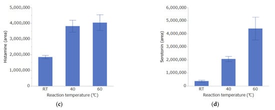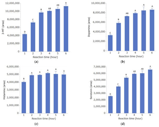 The results of the reaction time study are shown in Figure 3. For each substance, the concentration (area value) increased in a time-dependent manner. For all of the substances except histamine, the highest concentration was obtained 6 h after the start of the reaction, but there was no significant difference between this time and 4 h. Thus, the reaction time was set to 4 h.