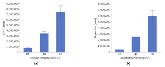 The results of the reaction temperature study are shown in Figure 4. The concentration increased in a temperature-dependent manner, and the reaction efficiency was maximal at 60 °C for all of the substances. Therefore, the reaction temperature was set to 60 °C.